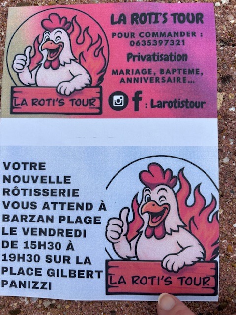 Une nouvelle rôtisserie vous attend à Barzan Plage tous les vendredis après-midi de 15H30 à 19H30 sur la place Gilbert Panizzi.